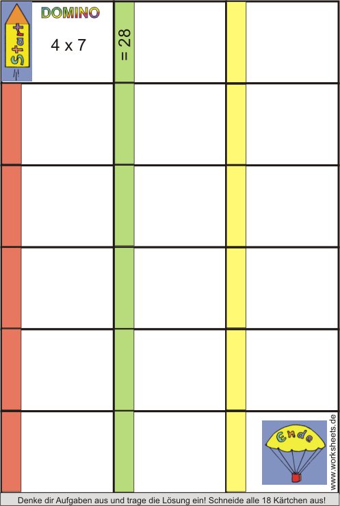 1x1 Domino In dieses Domino kann der Schüler nach seinem Vermögen den Schwierigkeitsgrad der Einmaleinsaufgaben bestimmen. Bis zur Hälfte sollte er Malaufgaben eintragen, in der zweiten Hälfte Teilaufgaben. Wenn alles eingetragen ist, schneidet man die 18 Kästchen aus, mischt sie und ordnet sie nun durch Ausrechnen der Aufgaben.