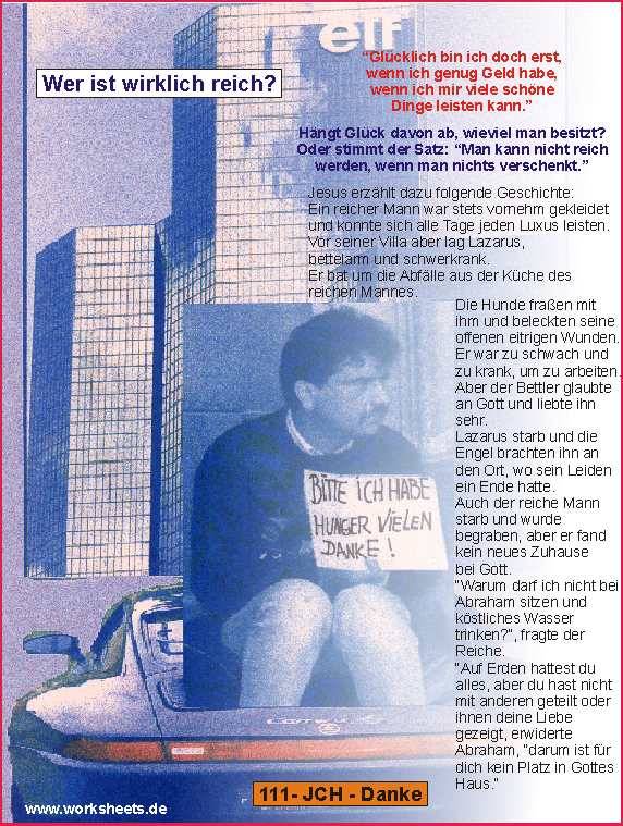 Dabei ist in der Tat jeder reich, der an Gott glaubt und mit dem zufrieden ist, was er hat. Denn wir sind auf diese Welt gekommen, ohne etwas zu besitzen, und genauso werden wir sie auch wieder verlassen. Wenn wir zu essen haben und uns kleiden können, sollen wir zufrieden sein. |