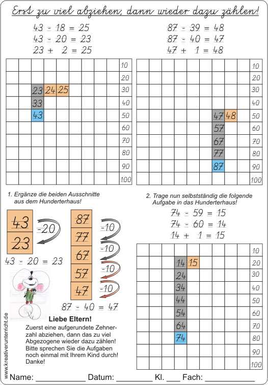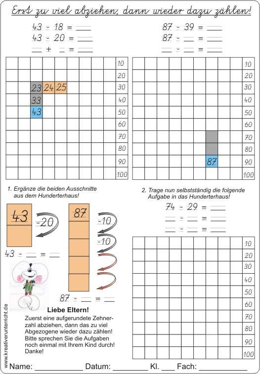 Subtraktion alternativ: Zuerst zu viel abziehen (meist eine runde Zehnerzahl), dann das zu viel Abgezogene wieder dazu zählen!