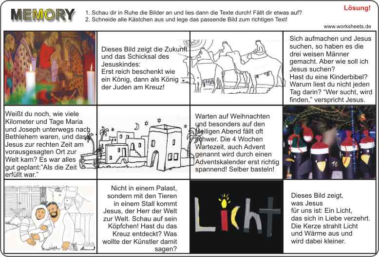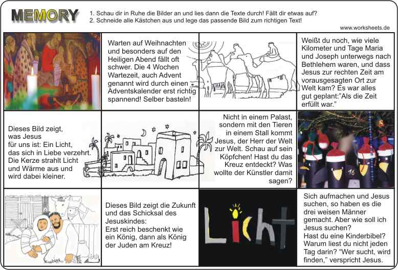 Avent-Weihnacht-Memory 1. Male die Zeichnungen aus! 2. Schneide alle 12 Kärtchen aus! 3. Ordne Bild und Text zu! 4. Wenn deine Zuordnung stimmt, kannst du mit deinem Nachbarn das MEMORY spielen.