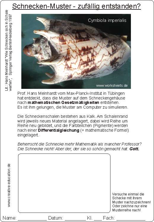 Prof. Hans Meinhardt vom Max-Planck-Institut in Tübingen hat entdeckt, dass die Muster auf dem Schneckengehäuse nach mathematischen Gesetzmäßigkeiten (Differentialgleichung) entstehen. Es ist ihm gelungen, die Muster am Computer zu simulieren.