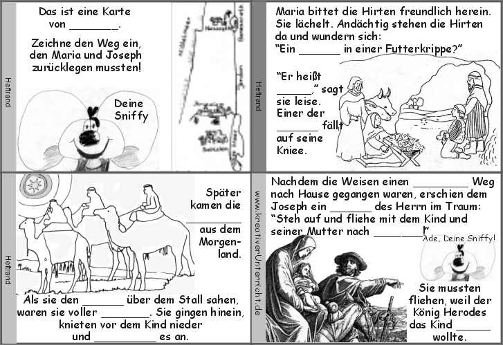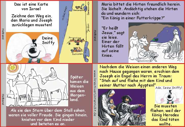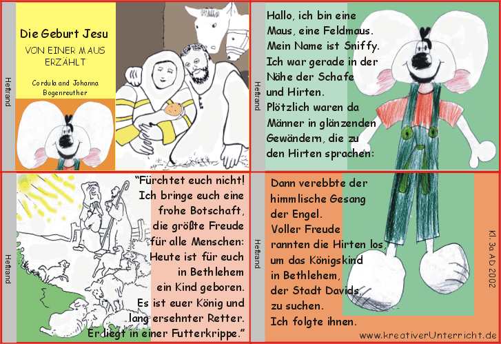 Die Weihnachtsgeschichte wird von einer Maus erlebt und erzählt. Cordula und Johanna Bogenreuter aus der Klasse 3a haben dazu gemalt. Zum Erzählen, Illustrieren und Korrigieren kann der Lehrer die Farbfolien verwenden. Im Klassengespäch lässt der Lehrer die Lücken der Arbeitsblätter gemeinsam ausfüllen. Anschließend können die Schüler ihr Weihnachtsheftchen farbig gestalten, ausschneiden und heften.