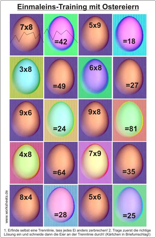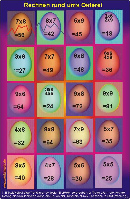 Einmaleins-Training mit Ostereiern! Alle 20 Kärtchen mit Trennlinie versehen, die Aufgaben ausrechnen, mit dem Nachbarn die Erge4bnisse vergleichen, dann alle 20 Kärtchen ausschneiden und dann die Eier an der Trennungslinie in zwei Hälften schneiden. Alle Teile kommen danach in den Briefumschlag können in der Freiarbeit wieder richtig gelegt werden. Die Kontrolle ist die passende Trennungslinie!