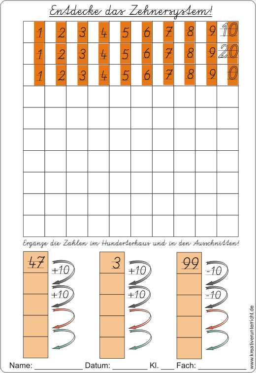 Entdecke das Zehnersystem im Hunderterhaus! Ergänze die Zahlen im Hunderterhaus!