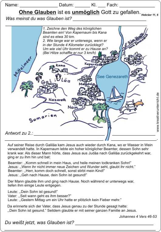 Ohne Glauben ist es unmöglich Gott zu gefallen. Glaubenohne das Wunder der Heilung zu sehen: Johannes 4, 46 -53. Arbeitsblatt mit Lösungsfolie