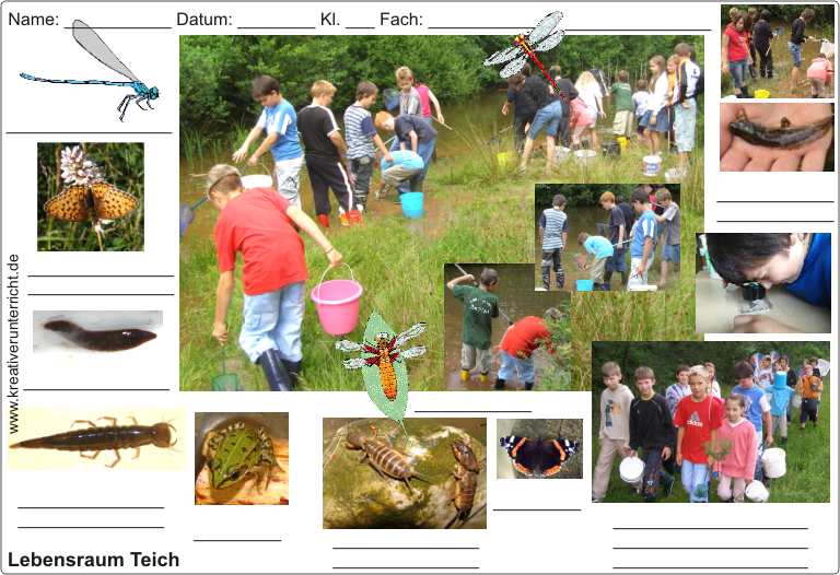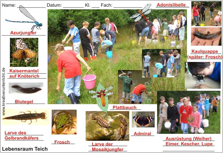 Lebensraum Teich (Gewässer, Weiher, See) Unterrichtsgang zum Weiher mit Eimer und Kescher und Beobachtung der Kleintiere mit Lupe