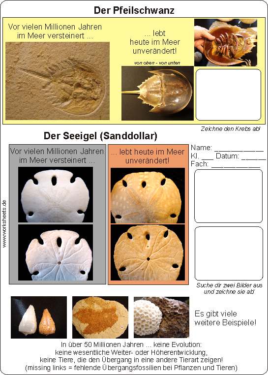 Gibt es wirklich eine Weiterentwicklung in Jahrmillionen? Zweifel beim Vergleich von Fossil und lebenden (recenten) Meerestieren: Pfeilschwanz, Seeigel usw.