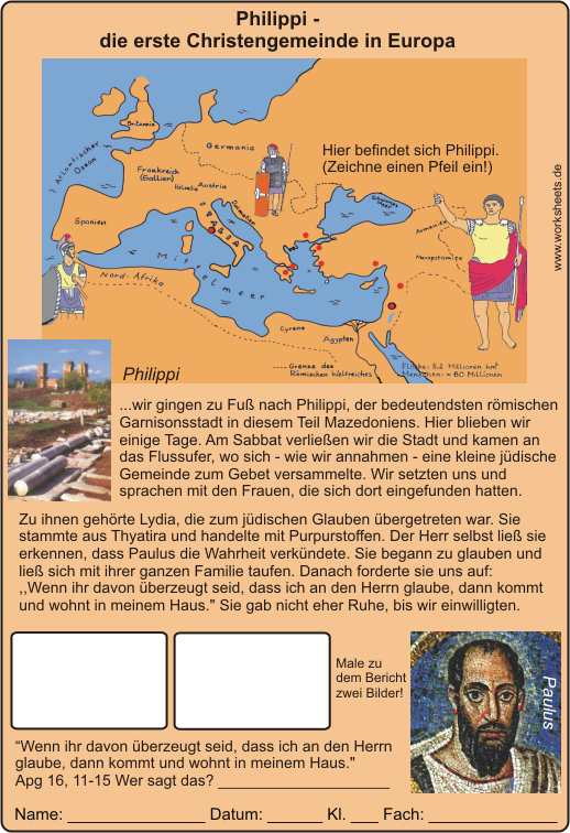 Philippi, die erste Christengemeinde in Europa bei der Purpurhändlerin Lydia. (Apostelgeschichte 16 Vers 11-15)