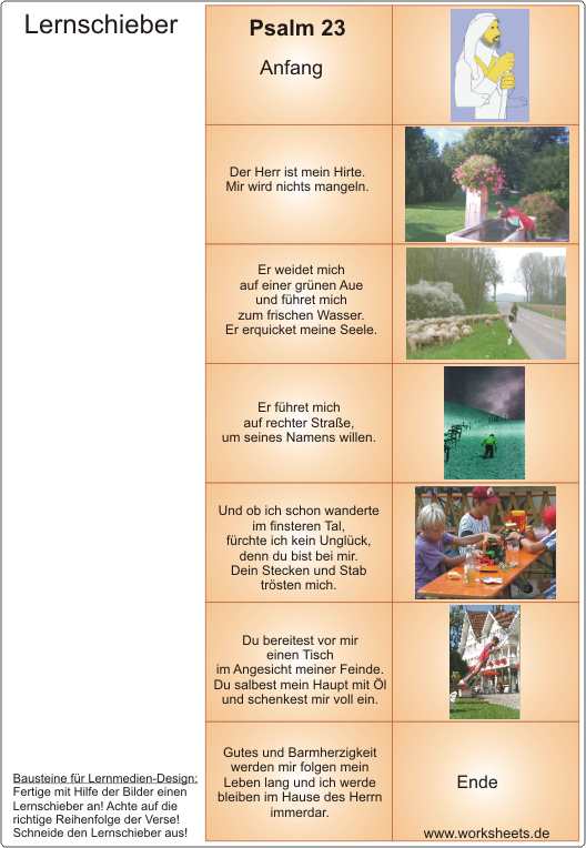 Psalm 23 Wir fertigen einen Lernschieber an - Bilder ausschneiden und an die richtige Stelle kleben, schräg darunter jeweils den passenden Text schreiben.
