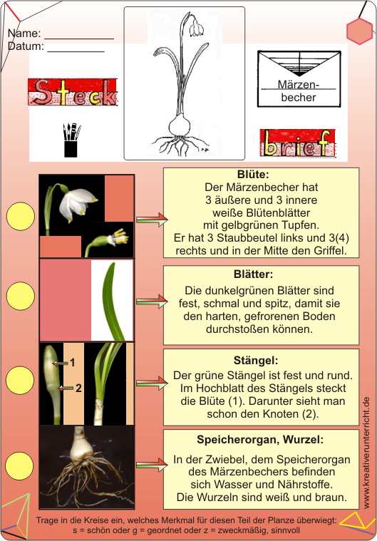 Steckbrief Märzenbecher: Blüte, Blätter, Stängel, Speicherorgan, Wurzel.