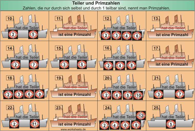 Lernziel: Teiler und Primzahlen herausfinden - Suche die richtigen Teiler (Rettungsringe) zu den Schiffen! Welche Schiffe haben keinen Teiler (außer 1 und die eigene Zahl)?.