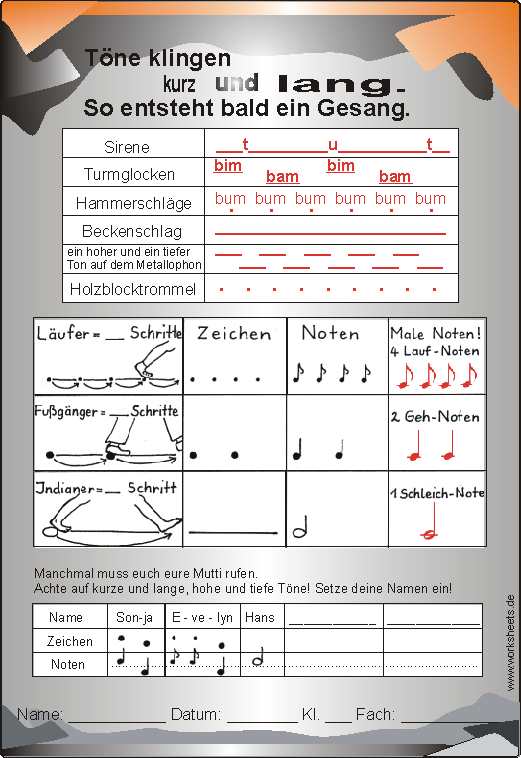 Kurze und lange Töne allgemein und dann speziell: Lauf-Noten, Geh-Noten, Schleich-Noten - Diese Erkenntnisse werden beim Rufen von Namen angewendet, erst in Zeichen, dann in Notenschrift.