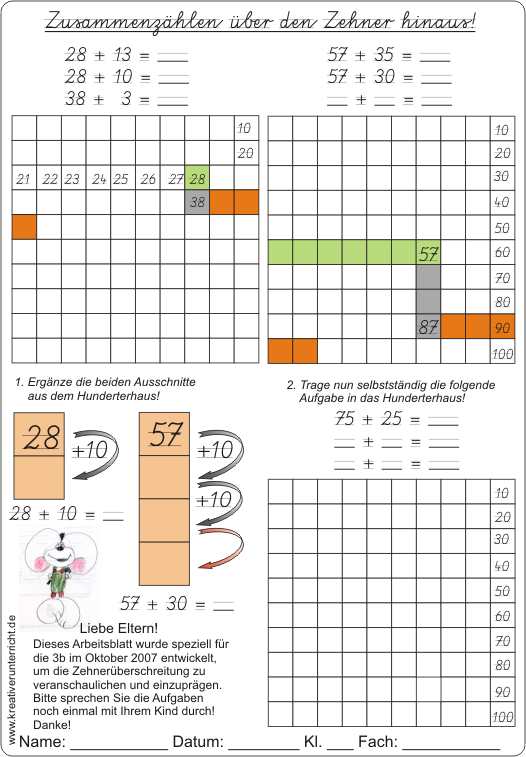 Zusammenzählen über den Zehner hinaus - Zehnerüberschreitung im Hunderterraum ist als Arbeitsblatt 2 nach dem Arbeitsblatt “Entdecke das Zehnersystem” gedacht! Die Zehnerüberschreitung wird hier visualisiert.